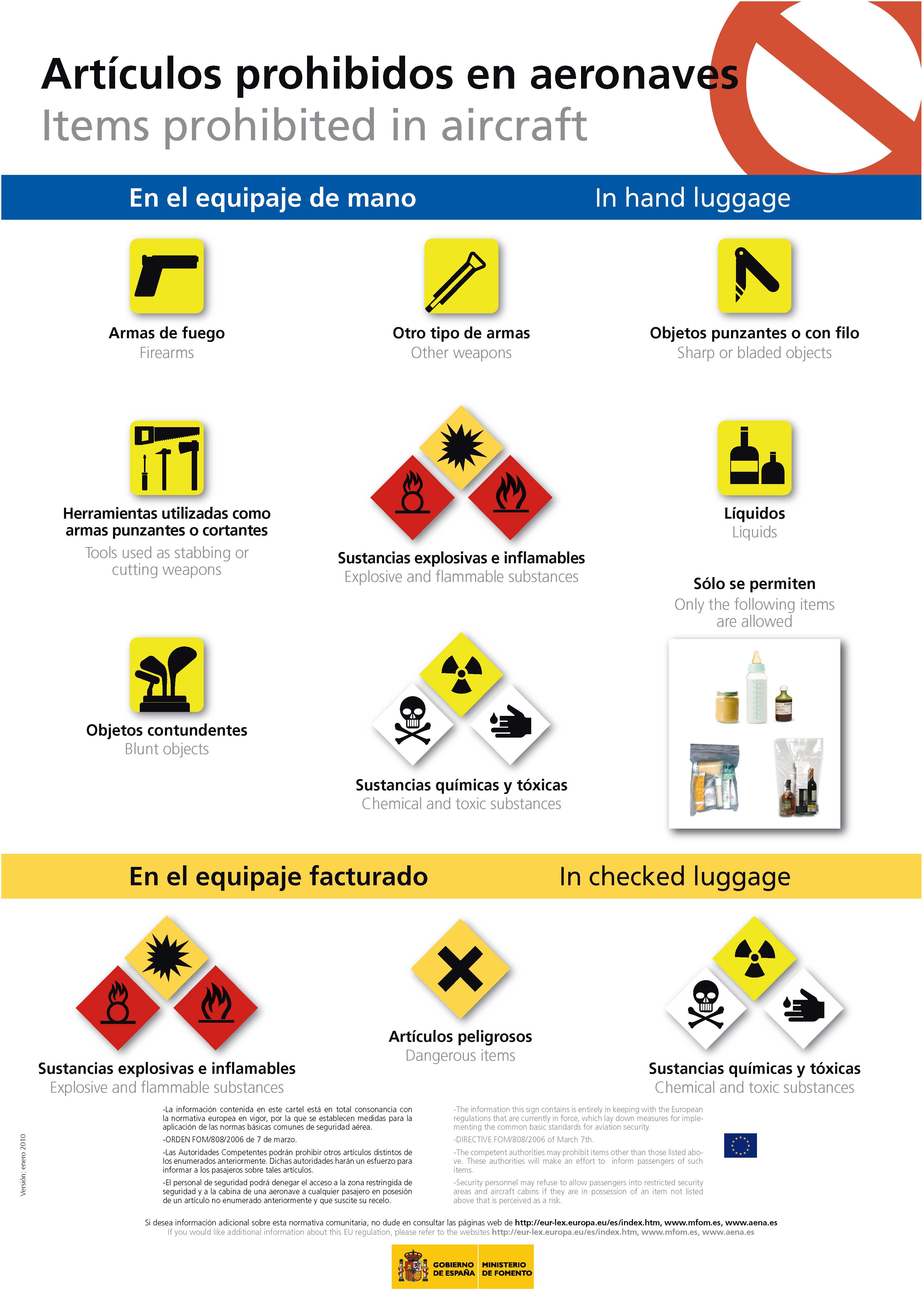Cartel de artículos prohibidos en aeronavesa para garantizar la seguridad de los pasajeros