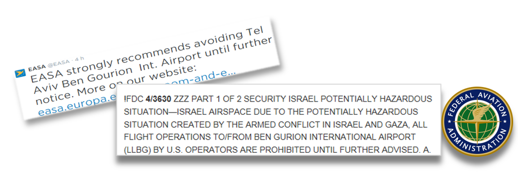 La Federal Aviation Adminitration (FAA), Autoridad Aeronáutica Estadounidense, establece la prohibición de vuelos sobre seis aéreas en conflicto (este de Ucrania y Crimea, Corea del Norte, Libia, Irak, norte de Etiopía y Somalia) señalando otras como potencialmente hostiles. A ellas hay que añadir la medida tomada ayer mismo de prohibir temporalmente los vuelos desde y hacia el aeropuerto de Tel Aviv por riesgos para la seguridad.