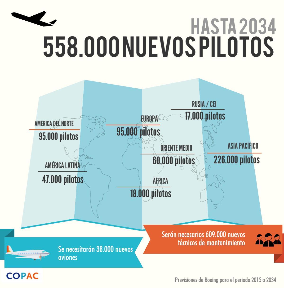 Se necesitarán 558.000 nuevos pilotos para los próximos 20 años según las previsiones realizadas por Boeing para el periodo 2015 a 2034. La flota mundial de aeronaves se incrementará en 38.000 aviones según la compañía estadounidense. Para su mantenimiento se precisarán 609.000 técnicos, por lo que el número total de profesionales requeridos será cercano al millón doscientos mil.