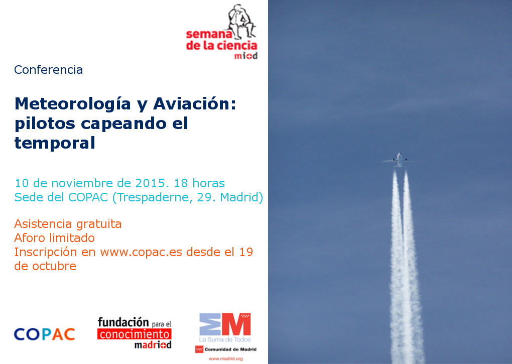 La ciencia y el conocimiento son un factor clave para la evolución de la sociedad. Desde el COPAC defendemos esta visión, ya que nos ofrece útiles herramientas para nuestro trabajo diario, permitiéndonos volar de forma cada vez más segura y eficiente. Por eso, este año volvemos a participar en la Semana de la Ciencia de Madrid. Lo hacemos a través de la conferencia Meteorología y Aviación: pilotos capeando el temporal. Queremos compartir con todas las personas que nos quieran acompañar cómo una disciplina científica como la meteorología nos ayuda a garantizar la seguridad en la planificación y el desarrollo de la operación aérea.