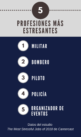 Parece que el trabajo de piloto y el estrés van de la mano. La de piloto de líneas aéreas es la tercera profesión más estresante según un estudio realizado por el portal de empleo estadounidense CareerCast. Solo se encuentra superada por los militares y bomberos. El estudio analiza diferentes variables, como la presión en las fechas de entrega, el grado de interacción con el público, la competitividad del mercado, las condiciones ambientales, el riesgo para la vida, las amenazas del entorno o las previsiones de contratación en la próxima década, entre otros.