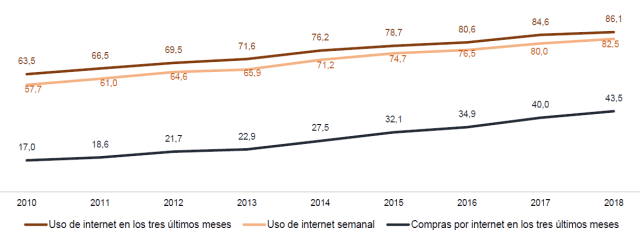 Según datos del Instituto Nacional de Estadística correspondientes a noviembre de 2018 un 43,5% de la población había comprado online en los últimos tres meses. Estos datos superan a los de años anteriores. El siguiente gráfico muestra el incremento de las cifras en ese mismo estudio de uso de las TIC desde 2010 y se percibe el significativo crecimiento anual.