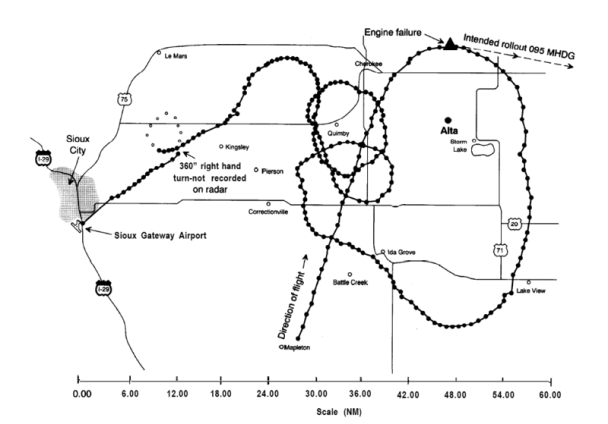 Trayectoria del avión. Informe técnico de la NTSB del accidente del vuelo 232 de United Airlines en 1989