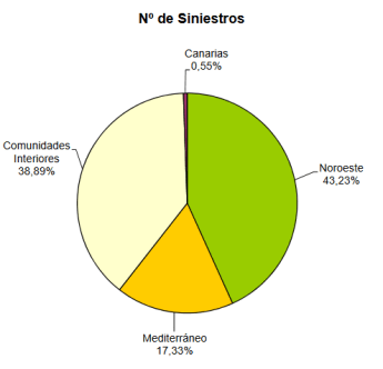 De acuerdo con los datos del Ministerio de Agricultura, Pesca y Alimentación hasta 31 de octubre de 2019 recogidos en el gráfico, la distribución por áreas geográficas del número de siniestros ha sido la siguiente: un 0,55% en Canarias, un 43,23% en el Noroeste, un 17,33% en el Mediterráneo y un 38,89% en las Comunidades Interiores. Cabe destacar que en Canarias, la superficie forestal afectada ha alcanzado un 12,24% del total nacional, mientras que la arbolada ha superado el 16% . En total, han asolado nuestro país 14 grandes incendios (son aquellos que superan las 500 hectáreas arrasadas).