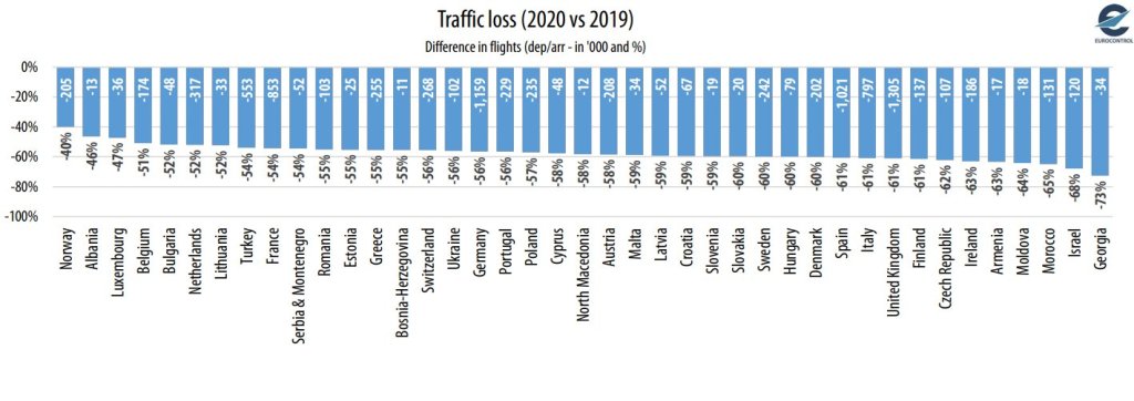 Todos los grandes grupos de transporte aéreo se han visto fuertemente afectados con una evolución similar: un fuerte descenso a partir de marzo debido a la primera ola con una leve recuperación durante los meses de verano. Se estima que el coste de puestos de trabajos directos perdidos por esta causa en Europa alcanza los 191.000.