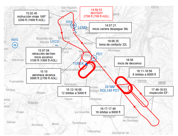 La Comisión de Investigación de Accidentes e Incidentes de Aviación Civil (CIAIAC) ha publicado el informe final de la investigación que puedes consultar aquí. En él se confirma que la causa del accidente fue la explosión de uno de los neumáticos producida por un objeto en pista de unos 1,5 mm de ancho y 70 mm de largo. Esto, a su vez, provocó fallos en uno de los motores y en el tren de aterrizaje, así como otros desperfectos menores en el fuselaje de la aeronave.